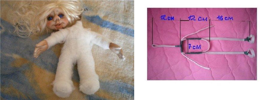 Для их основы изготавливают проволочный каркас длиной 30 см. Он состоит из петельки 12 см для головы, овального туловища 12см и ног 16 см. Отдельно приматываются ручки изолентой и делаются петельки на концах ножек для обуви.