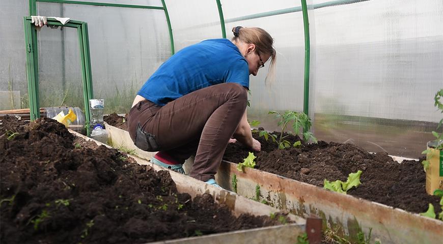 1. Сначала распределите рассаду по теплице. Если рассады не хватает на всю теплицу — посадите чуть реже, или оставьте кусочек земли под что-то еще.