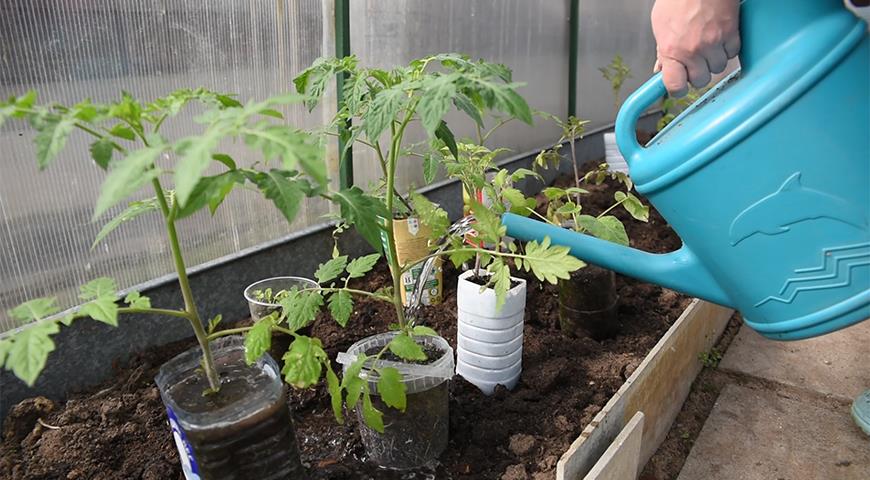 Первые 10-15 дней после высадки рассады помидоры можно не поливать, им хватит влаги, внесенной во время посадки. С появлением завязей потребность в воде у томатов резко возрастает. В это время растения поливают с интервалом в 5-7 дней, внося под каждый куст до 5 л воды.