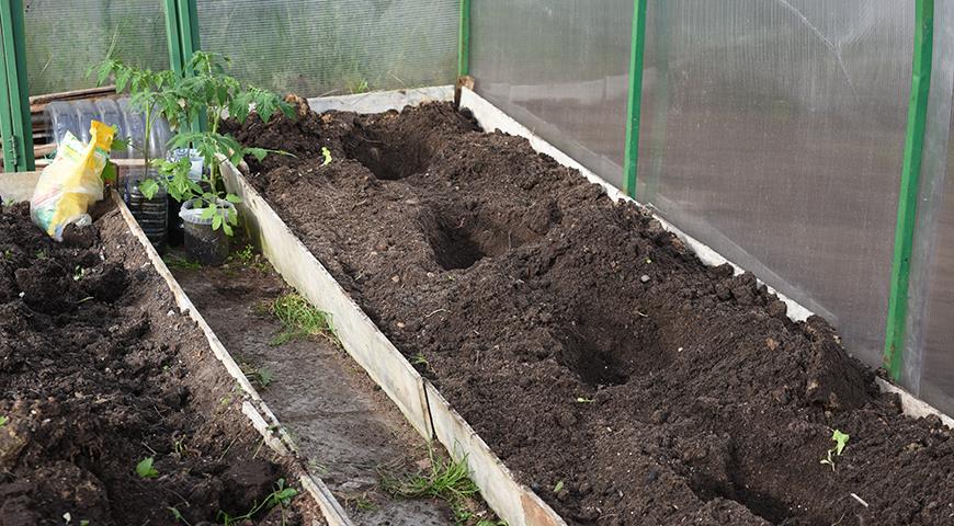 При подготовке грядки для томатов вносят 1 ведро перепревшего навоза, смешанного с 2 стол. ложками двойного суперфосфата, сульфата калия и 2 стаканами древесной золы на 1 кв. метр. Почву перекапывают на глубину 25-30 см.