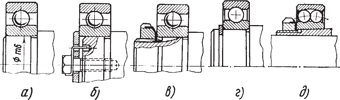 Рис. 2. Основные схемы крепления подшипников на валу: а – неподвижное соединение по прессовой посадке; б – торцовой шайбой с винтом и стопорной планкой; в – круглой шлицевой гайкой и стопорной шайбой; г – стопорным кольцом; д – конусной разрезной втулкой и натяжной круглой гайкой и стопорной шайбой