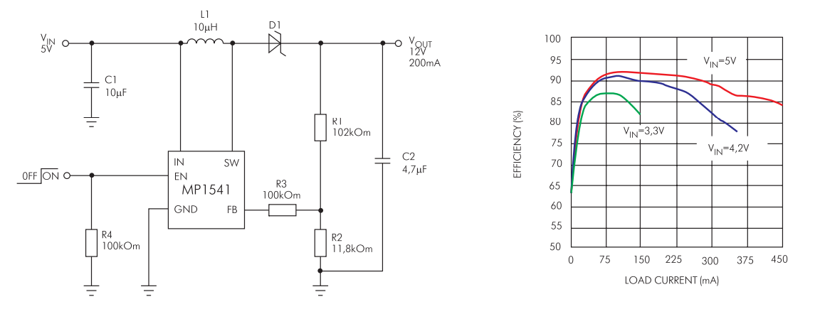 Для применений, требующих постоянной частоты коммутации, альтернативой MP1522 служит микросхема MP1541 (рисунок 20), также выпускающаяся в корпусе SOT23-5. Она позволяет реализовывать надежные, миниатюрные и недорогие преобразователи напряжения с током нагрузки до 550 мА.