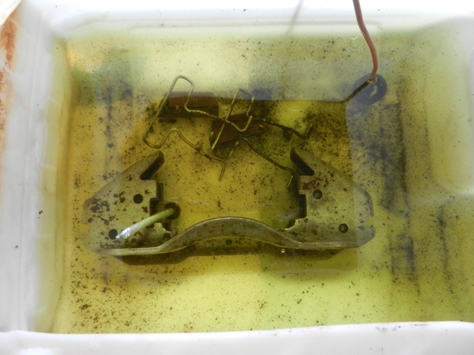 Перед началом работы металлическую поверхность требуется обезжирить, что можно сделать при помощи средства для мытья посуды. Далее изделие помещается в концентрированный раствор (80 г лимонной кислоты на 100 мл теплой воды) на несколько часов. При этом реакция начинается уже через несколько минут, о чем сигнализируют образующиеся пузырьки. После завершения реакции поверхность нужно промыть под проточной водой, при необходимости удаляя остатки загрязнения металлической щеткой.