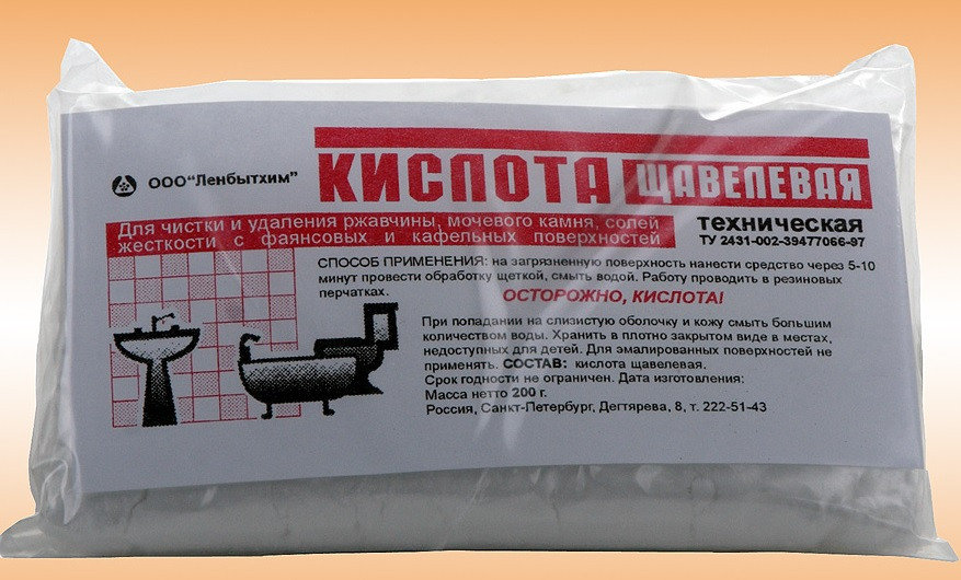Щавелевая кислота – препарат, который выпускается в форме порошка. Это средство дает хороший результат, но требует очень аккуратного применения, так как является ядом. Использование можно проводить только с соблюдением всех необходимых защитных мер.