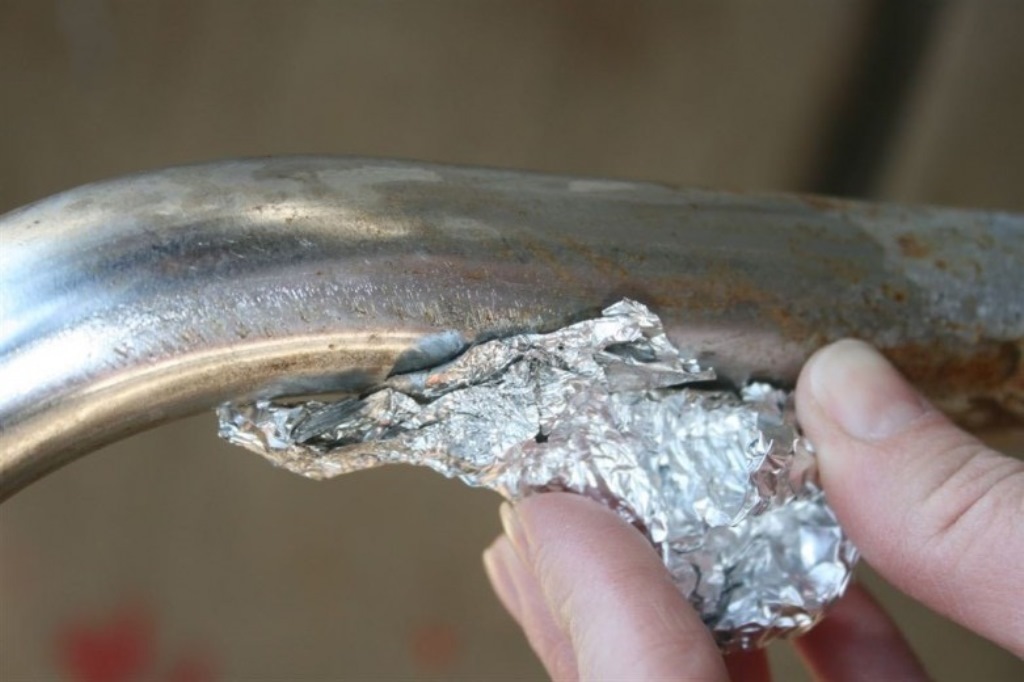 В данном случае фольга выступает как аналог абразивной щетки, то есть оказывает исключительно механическое воздействие. Кусочек фольги необходимо скомкать в плотный шарик, которым можно очищать поверхность. Стоит учитывать, что данный способ подойдет для небольших загрязнений на бытовой технике. А вот для чистки ржавых труб лучше использовать химические средства.