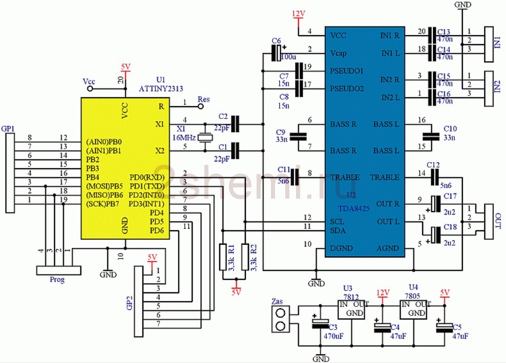 Базой схемы является микроконтроллер U1 (ATTiny2313) вместе с кварцевым резонатором X1 (16 МГц) и конденсаторами C1 (22pF), C2 (22pF). Резисторы R1 (3,3 k) и R2 (3,3 k) подтягивают потенциал линии SCL и SDA шины I2C к плюсу питания, обеспечивая правильные условия работы МК. Обработкой сигнала звука занимается микросхема звуковой процессор U2 (TDA8425). Аудио сигнал подается на разъемы IN1 и IN2 через конденсаторы C13 — C15 (470nF). На выход предусилителя (разъем OUT) сигнал тоже попадает проходя конденсаторы C17 (2,2 мкф) и C18 (2,2 мкф). Остальные конденсаторы C6 — C12 были применены в соответствии с рекомендациями производителя на основе официального даташита.