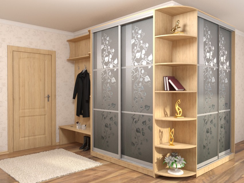В угловой комнате решительно все подчинено идее максимального задействования пространства, а точнее, пустующего угла. По сторонам от шкафа-купе могут встать открытые полки, в других местах ставятся тумбы и вешалки классического вида. Дополнительно сберечь площадь коридора можно, если двери шкафа будут зеркальными.
