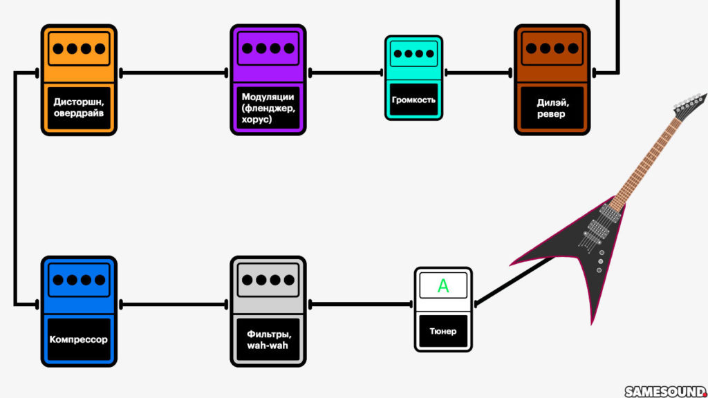 Гитара – нойз гейт – компрессор – wah-wah – перегруз – эквалайзер – хорус – дилей – ревер – Input усилителя.