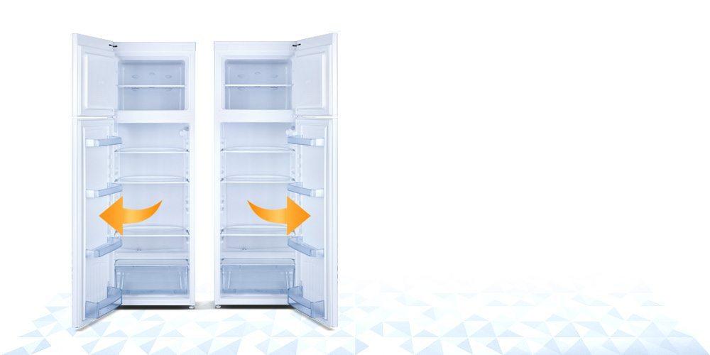 В некоторых моделях холодильников это можно сделать без особого труда, ведь там уже предусмотрены отверстия для ручек и петель с противоположной стороны дверцы.