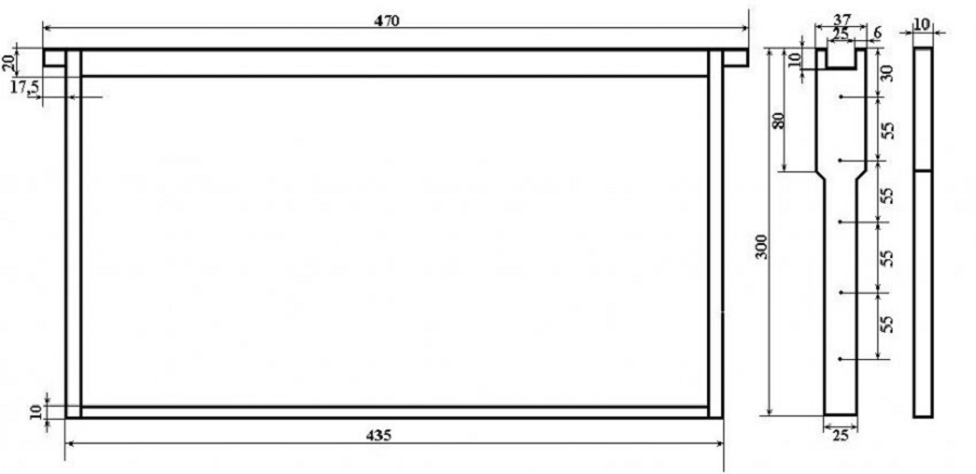 Составляющие части каждой рамочной формы — это брусок верхний и нижний (по 1 шт.), а также две боковые планки. Длина верхнего бруска обязательно должна предусматривать с каждой стороны по 1 см для установки каркаса в улей (на этих «ушках» он и будет держаться).