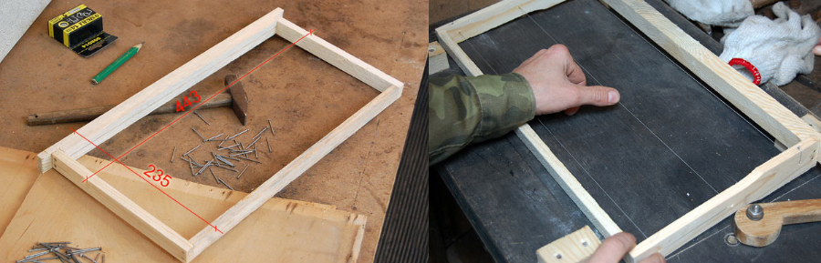 Материалы для рамочного каркаса: деревянные сухие рейки, зашкуренные и подготовленные к сколачиванию, а также моток тонкой проволоки (можно купить в магазине для пчеловодов или на строительном рынке). Инструменты для изготовления: шило, молоток, плоскогубцы или крепкие кусачки, гвозди сапожные (тонкие и небольшие). Заготовка делается на удобной поверхности — столе или станке, чтобы все элементы были на виду и под рукой. Также можно использовать зажимы для лески, чтобы фиксировать её с двух сторон при натягивании.