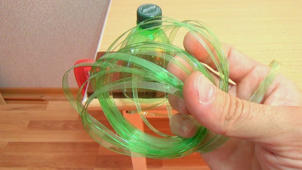 - От бутылки отрезается донышко, производится небольшой надрез, продергивается через пропил необходимой ширины. Теперь необходимо тянуть за отрезанный конец, нарезая бутылку до самого горлышка.
