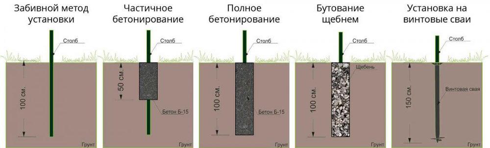 Наиболее надёжным способом считается монтаж опор с полным бетонированием. В первую очередь необходимо произвести установку крайних опор. Нужно вырыть ямы для столбов шириной 150 мм и глубиной 1—1,5 м. Земляные работы легче производить с помощью ручного бура. Величина заглубления зависит от планируемой высоты забора: чем больше высота ограждения, тем глубже придётся опускать опоры.