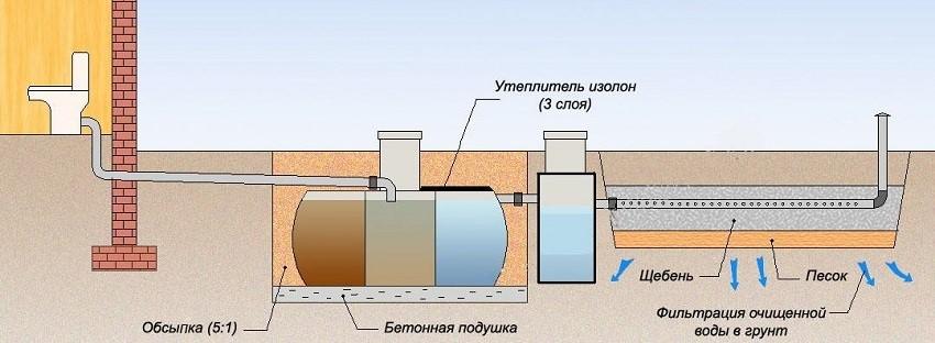 Ее особенностью является многокамерный септик или несколько установленных друг за другом септиков.