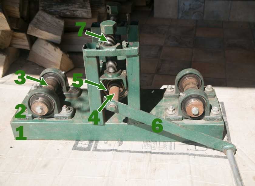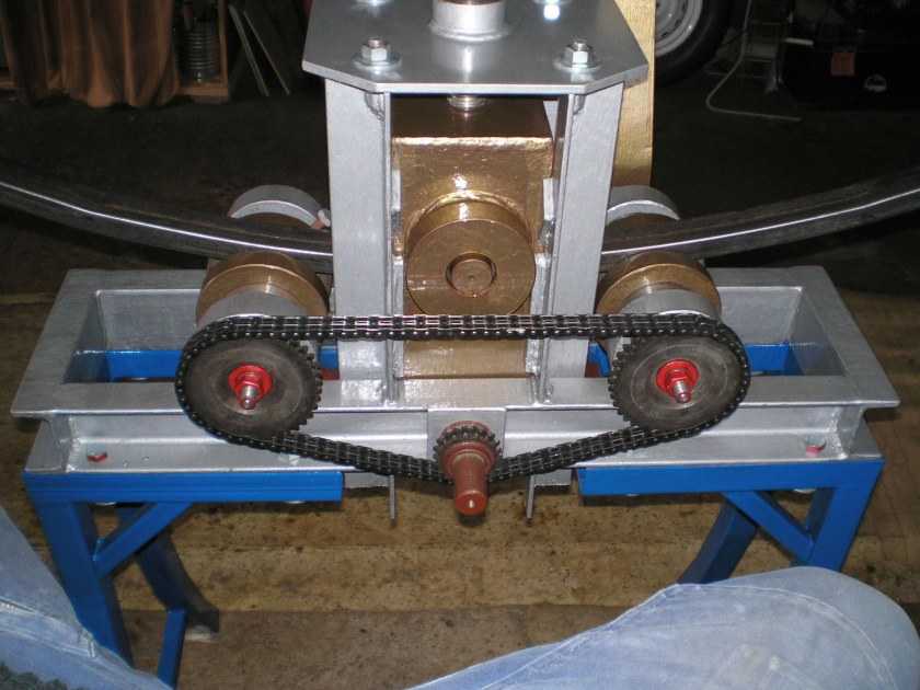 Одна ось должна быть чуть длиннее, чтобы закрепить ручной привод, а катки устанавливаются на подиумы. В случае максимального опущения центрального ролика радиус изгиба детали не будет большим.