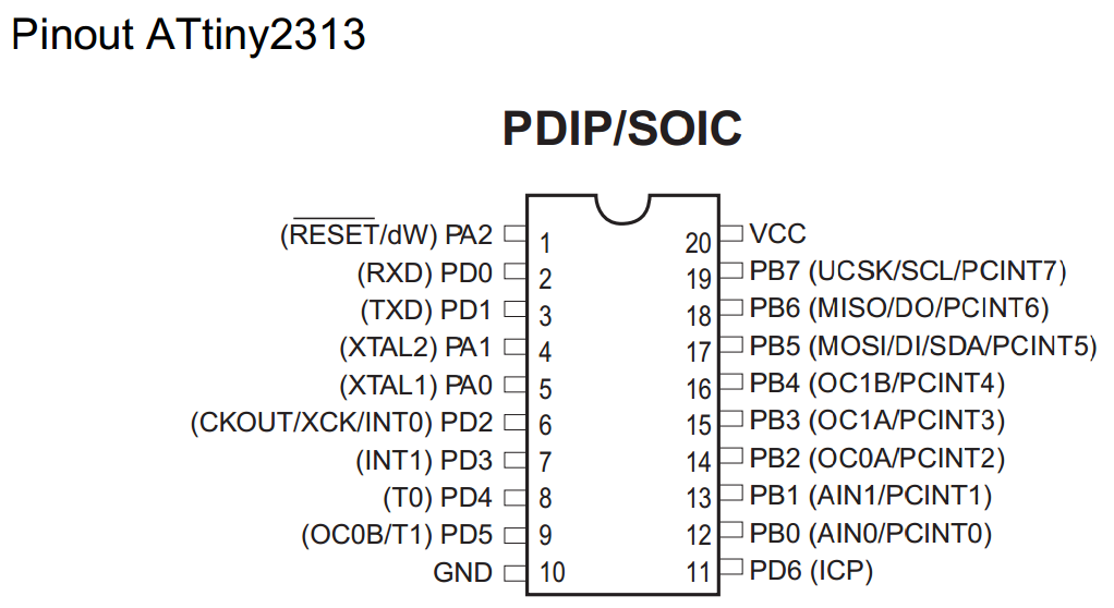 Далее качаем даташит на наш МК. В данном случае у нас Tiny2313. Ищем в даташите лист с его цоколевкой: