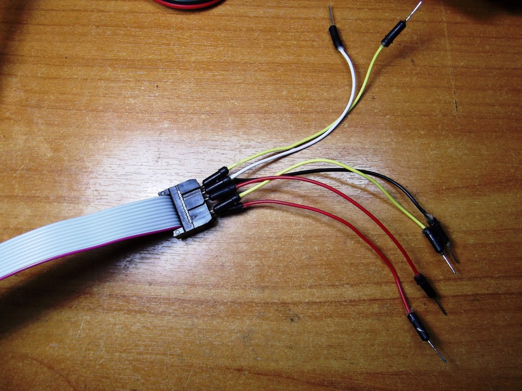 Для этого в разъем шлейфа втыкаем провода в гнезда MOSI, RST, SCK, MISO, VTG (VCC), GND. GND я взял 10 гнездо, можно и другое, где написано GND. Итого 6 проводков-джамперов: