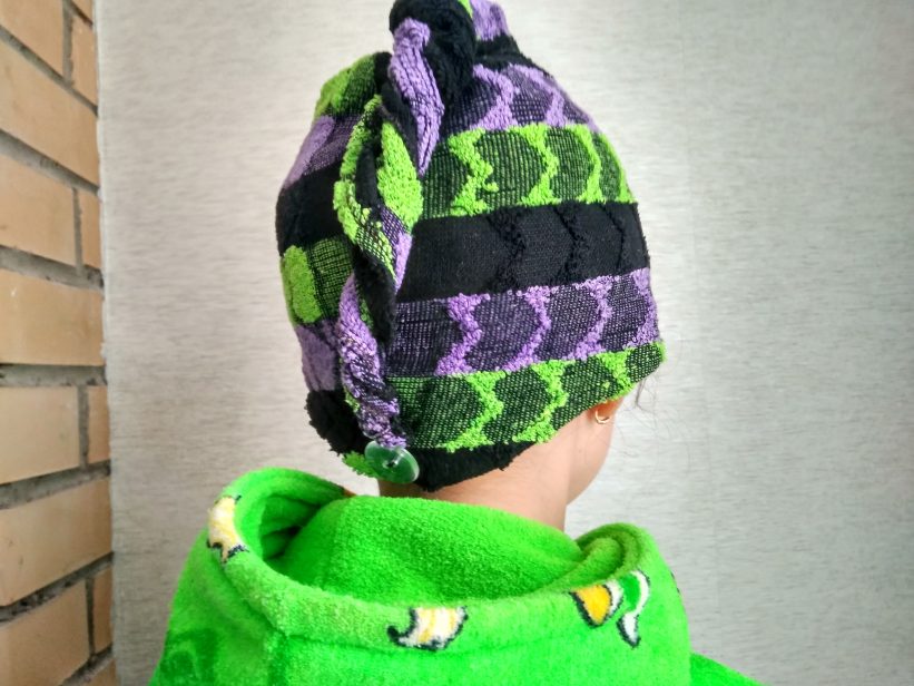 9. Тюрбан на голову для ванной. Все что вам понадобится — это старое или ненужное полотенце. Выкройка для него не понадобится, а чтобы сшить нужно сделать всего один шов.