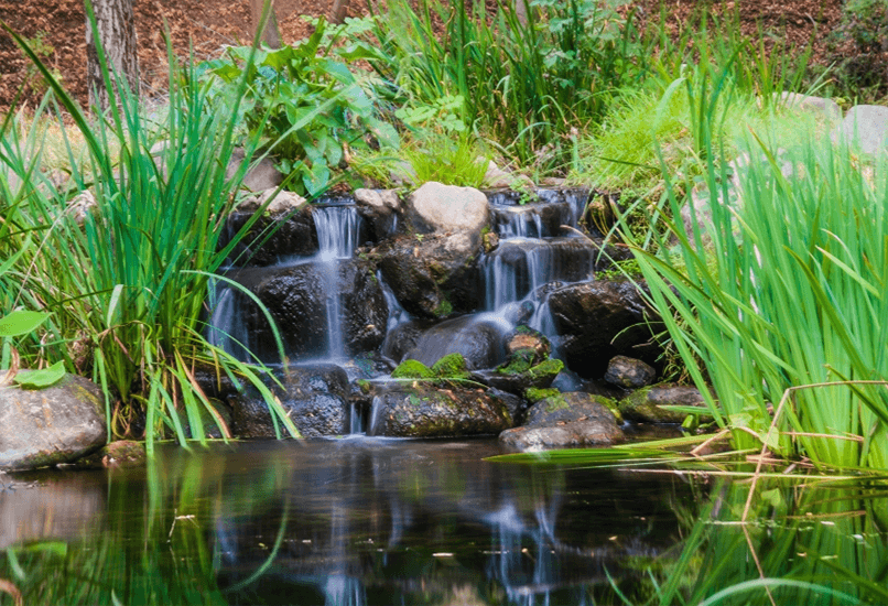 - Отыщите чистое место. Обычно, для этого подойдет площадка 2 на 2 м. Расположение дачного водопада лучше продумать так, чтобы он был на расстоянии от дома не меньше 3м, а также листья и корни деревьев не испортили водоем.