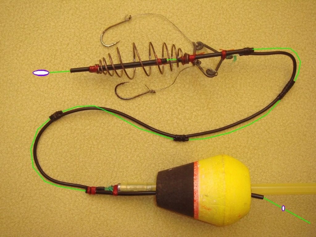 - В первом варианте подобно фидеру, леску продевают через специальные отводные трубки и, таким образом, снасть вольна свободно ходить по плоскости проволоки. Если вы не хотите, чтобы при резком забросе она спутывалась или сбивала приманку, стоит установить два ограничителя. Поводки для удобной ловли крепят при помощи карабина, если ваш поплавок не способен выдержать такой дополнительный груз, можно использовать и метод «петля в петле».