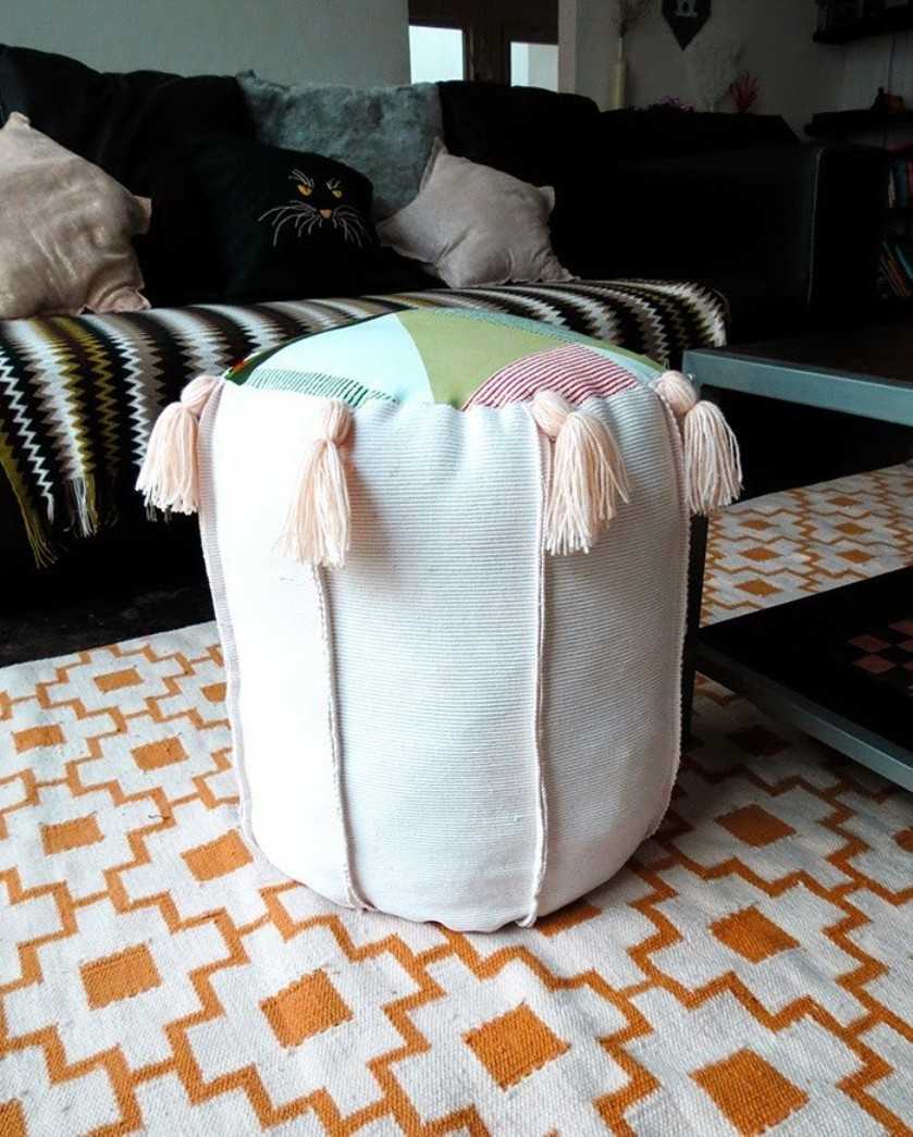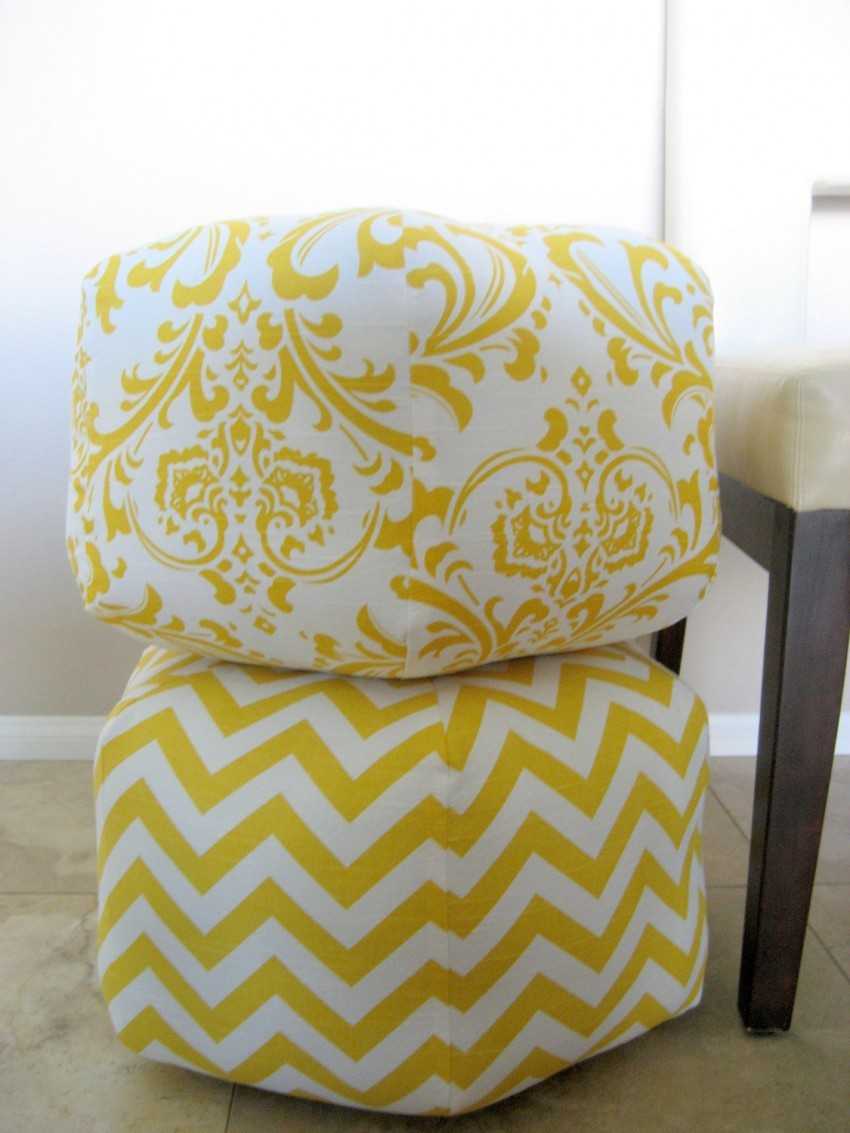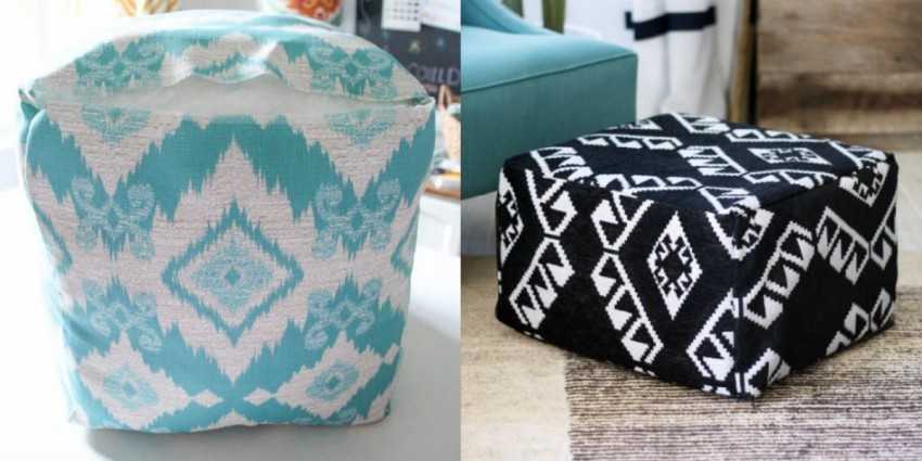 Из них можно сшить интересный, прочный, практичный футляр. Такой пуфик станет настоящим украшением интерьера в модном, современном стилевом направлении.