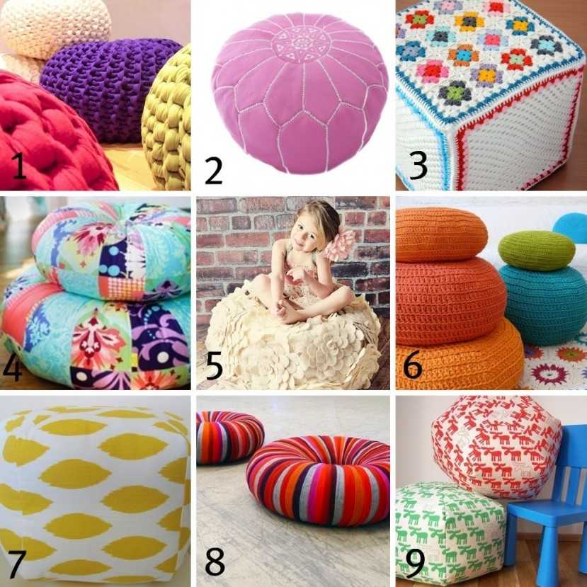 Украсить изделие можно различными способами. Например, рюшами. Пришивать рюши нужно по кругу. Это будет очень стильно. Такой пуф идеально впишется в детскую комнату. Отличным решением станет использование старых джинсовых брюк, юбок.