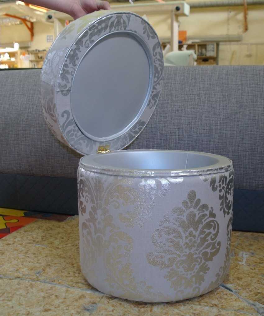 Для обивки обычно используют поролон – его фиксируют нитками, скотчем, строительным степлером. Мягкий материал крепят со всех сторон, кроме дна.
