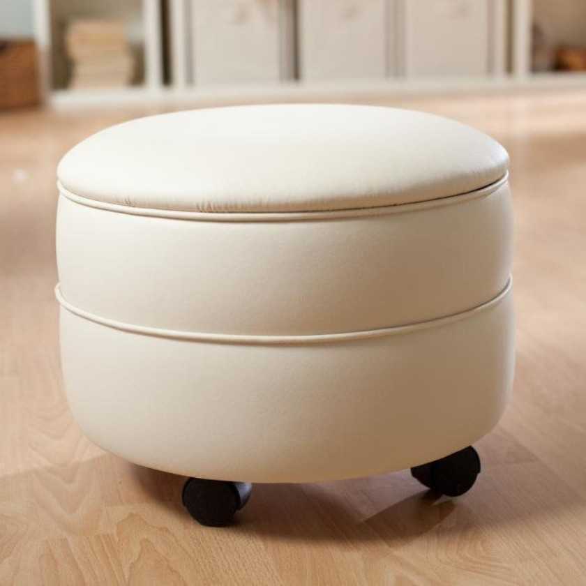 Этот вариант подойдёт скорее тем, кто не боится работы с молотком и гвоздями. Для изготовления пуфика вам понадобятся: ДСП (прямоугольный кусок размерами 40 см на 30 см в количестве 4 шт.), круг из того же ДСП (диаметром 30 см), бруски деревянные 4,8 см (4 шт.), специальные мебельные колёса с крепежами для них, специальный клей для дерева, уголки металлические, саморезы, ткань и поролон для обивки пуфика.