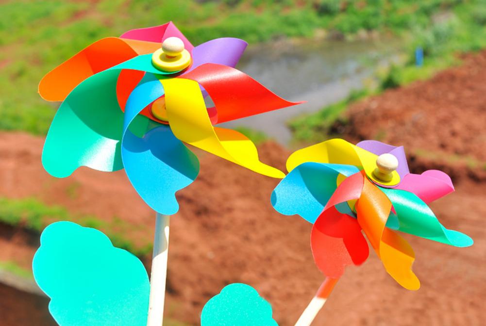 Прекрасно смотрится мельница с пёстрыми лентами на крыльях. Механизм вращения крыльев и поворота по ветру можно соорудить даже из старых детских игрушек-каталок. Из бутылок ПЭТ получаются забавные и громкие вертушки-трещотки. Бутылку одевают на шест, вырезают лопасти – и от малейшего ветерка бутылка завертится. Вместе с детьми на тему бутылок можно фантазировать бесконечно. Это может быть пингвин с лопастями–крыльями. Из бытового пластикового мусора получатся попугаи, матрёшки, монстры…