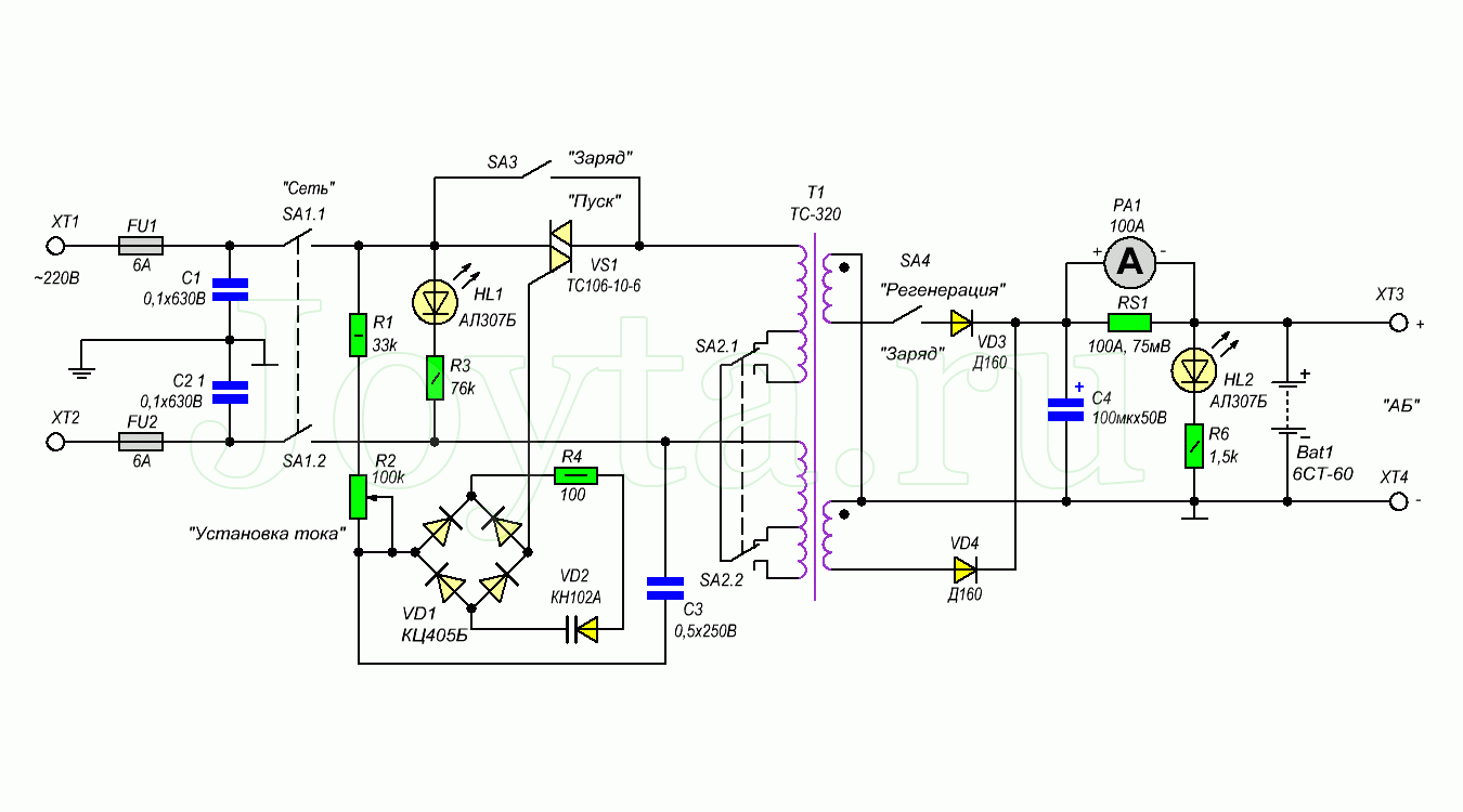 Недостатками являются его габариты и вес. Если нет возможности купить, то нужно собрать пуско-зарядное устройство для автомобиля своими руками. Трансформаторный тип имеет достаточно простое устройство (схема 1).