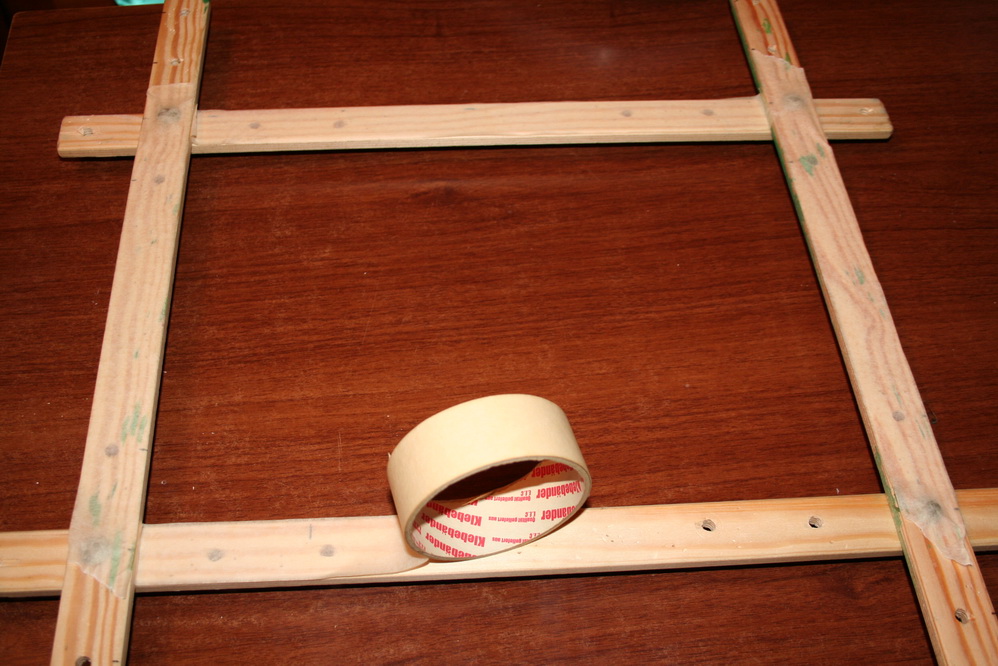 - Концы планок смазывают клеем ПВА и плотно прижимают под углом 90 градусов. Для фиксации углов рамку следует крепко перевязать шпагатом, следя за тем, чтобы углы не сместились. Можно использовать для фиксации углов половинки скоб от степлера. Они режутся на две Г-образные половинки. Далее эти уголки вставляют в средину спилов на концах деревянных реек, а затем две стороны рамки соединяются.