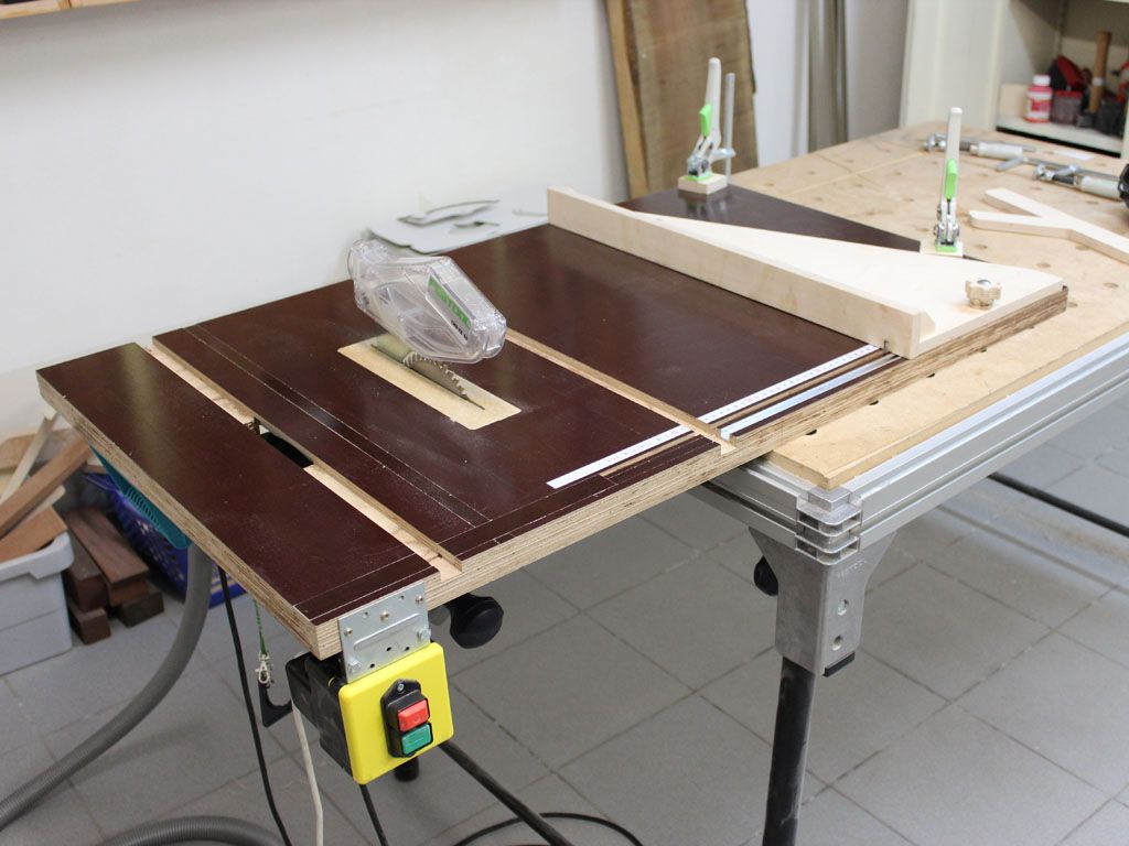 - Стол можно дополнить всем, чем угодно, к примеру, некоторые умудряются присоединить к нему специальный пылесос или расклинивающий нож с защитой для диска, для того чтобы стружки и остатки от резки дерева не летели по сторонам.