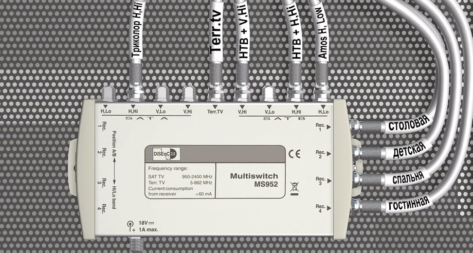 - Для спутника Amos 2/3 4.0w понадобится только 1 кабель SAT. Прием телеканалов: горизонтальная поляризация (Н) и нижний диапазон (Low) – вход мультисвитча H, Low.