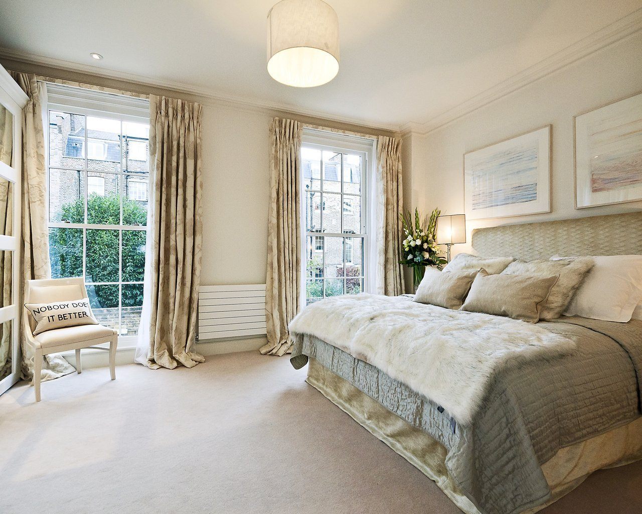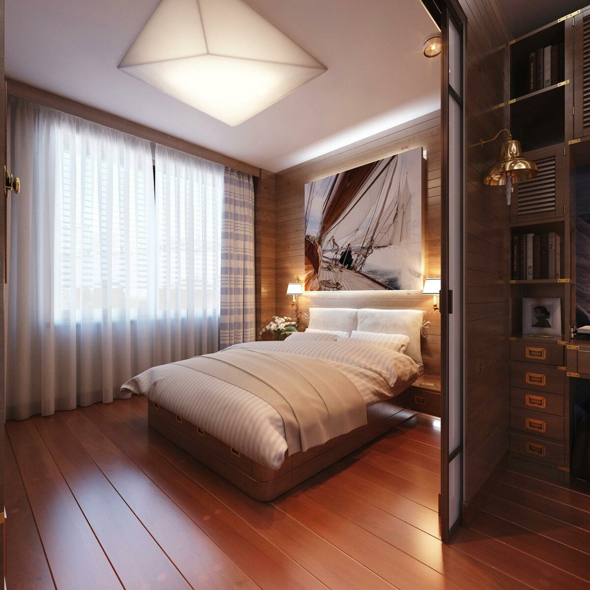 Дверь спальни должна быть без стекла, чтобы лучше приглушать звуки. Если комната должна быть со стороны улицы, стоит инвестировать в окна с повышенной звукоизоляцией.