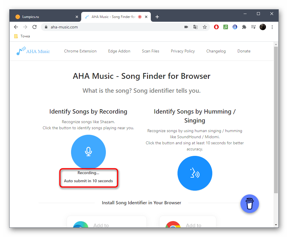 Напойте композицию или воспроизведите ее рядом с микрофоном. Запись происходит на протяжении десяти секунд и ее можно завершить досрочно, но мы не советуем этого делать. Прослушивание всего отрывка нужно для того, чтобы повысить точность распознавания.