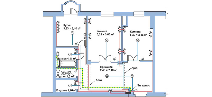 - Электрическую цепь санузла разветвляют с учетом числа помещений.