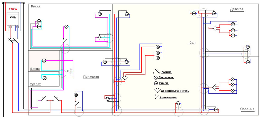 Это план (чертеж), где графически показано, где должно находиться определенное количество выключателей, розеток, осветительных приборов. Принципиальную схему разрабатывает каждый электрик, которому доверили работы. Однако разводка электропроводки может быть реализована и собственными силами. Главное правильно рассчитать планируемую нагрузку, а кабели разделить на группы. Система должна включать счетчик учета расхода электроэнергии. Также потребуются приборы защиты, заземление, если в многоквартирном доме это запроектировано изначально.