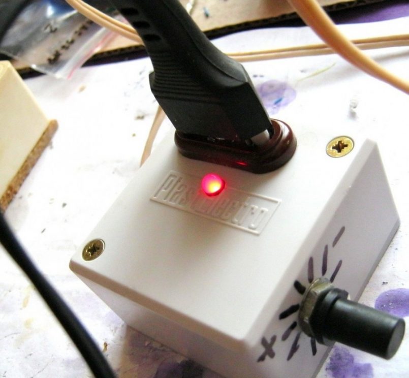 Схема также может поместиться в корпусе наружной розетки, в маленькой пластиковой распаячной коробке. Мощность самоделки ограничена диодным мостом (1000 В, 4 А), тиристором. Напомним, в нашем примере предел чуть больше 800 Вт, максимум — 1000 Вт. Для бытовых условий этого более чем достаточно.