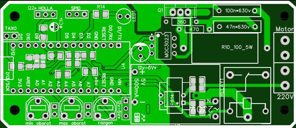 Реле служит защитой от пробоя симистора. Когда симистор пробивает, двигатель будет выходить на максимальные обороты, и это очень опасно . А что бы этого не случилось, контроллер отслеживает частоту вращения двигателя, и при превышении установленных оборотов реле отключает двигатель. Как обороты упадут ниже нормы, реле включится. Разъем Р7 — для подключения коллекторного электродвигателя.