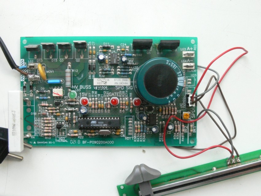 Реле служит защитой от пробоя симистора. Когда симистор пробивает, двигатель будет выходить на максимальные обороты, и это очень опасно . А что бы этого не случилось, контроллер отслеживает частоту вращения двигателя, и при превышении установленных оборотов реле отключает двигатель. Как обороты упадут ниже нормы, реле включится. Разъем Р7 — для подключения коллекторного электродвигателя.