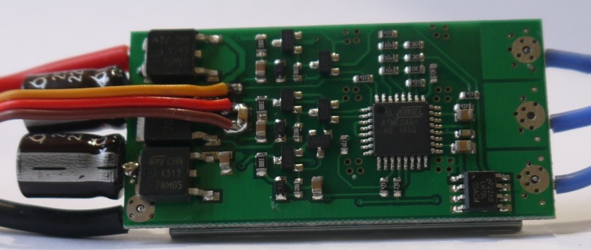 В схеме были сделаны небольшие изменения. Кое что выкинул. Некоторые компоненты заменены другими. Были добавлены 2 аналоговых входа, на них можно повесить датчик температуры и следить за температурой двигателя, и радиатора на котором сидит симистор управляющий двигателем.