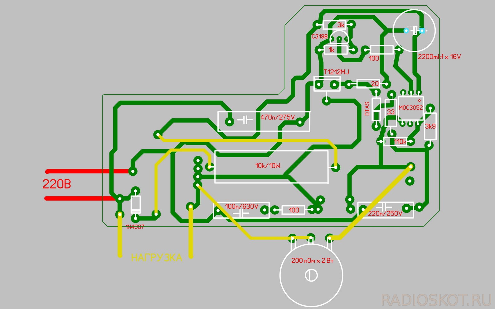 Печатная плата в итоге приняла вот такой рисунок. Внесённые изменения в схему регулятора мощности в данном конкретном случае позволили применить её для регулирования мощности нагревательной спирали термовоздушного паяльного фена приобретённого на AliExpress. Замер сопротивления нагревательной спирали дал 70 Ом, применив формулу нахождения мощности по известным сопротивлению и напряжению: