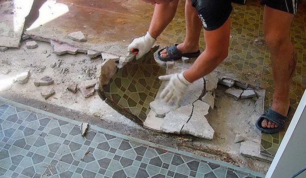 Для этой достаточно грязной процедуры нужно позаботиться о наличии перчаток, головного убора и специальной одежды во избежание травм и негативного влияния на здоровья. Строительный мусор лучше складывать на тележку или что-то подобное, так как мусорные пакеты часто рвутся под тяжестью старого напольного покрытия. Чтобы демонтировать кафельный пол понадобится перфоратор, кувалда и зубило, а для деревянного пола столько силы применять не потребуется. Если же замена напольного покрытия не требуется, необходимо тщательно закрыть его, чтобы предотвратить его повреждение.