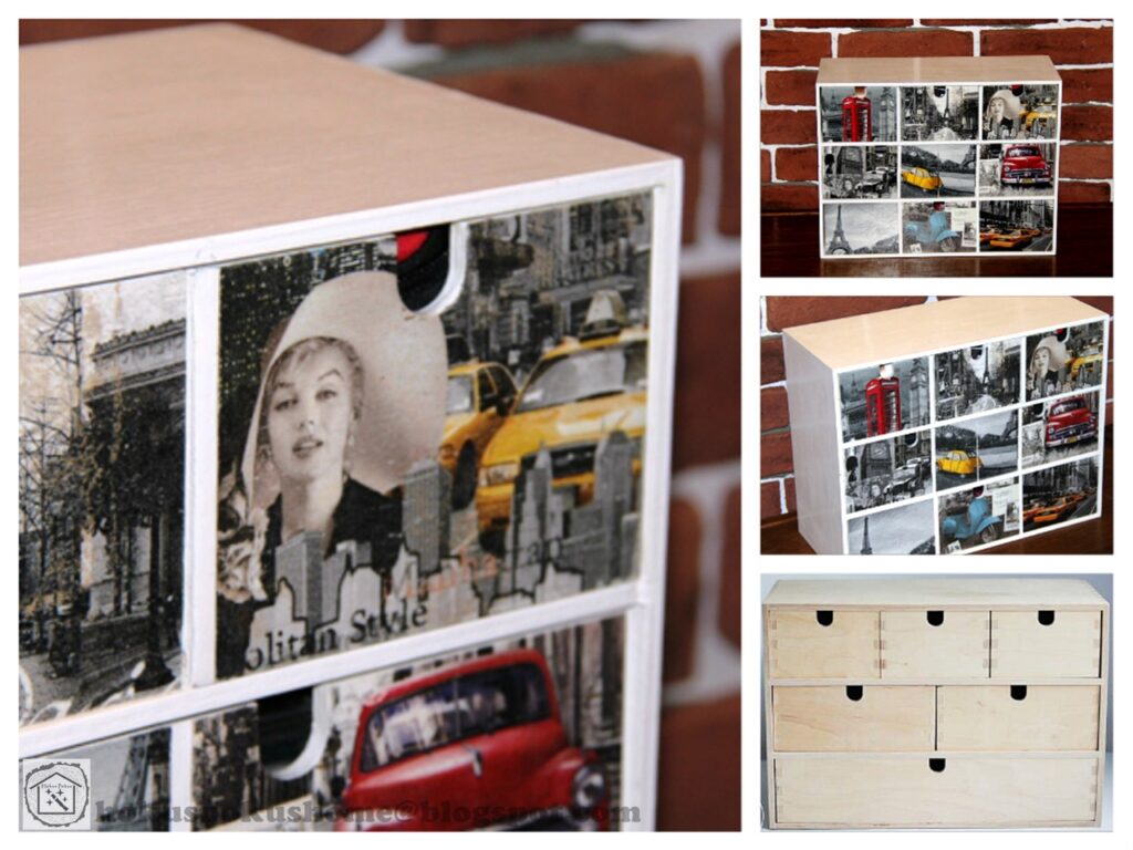 Этим способом можно не просто отреставрировать из ДСП изготовленные изделия, но и полностью изменить их первоначальный вид. Эффектно смотрятся столешницы в ретростиле, для отделки которых используются картинки соответствующей тематики. Подходит декупаж и для искусственно состаренной мебели.
