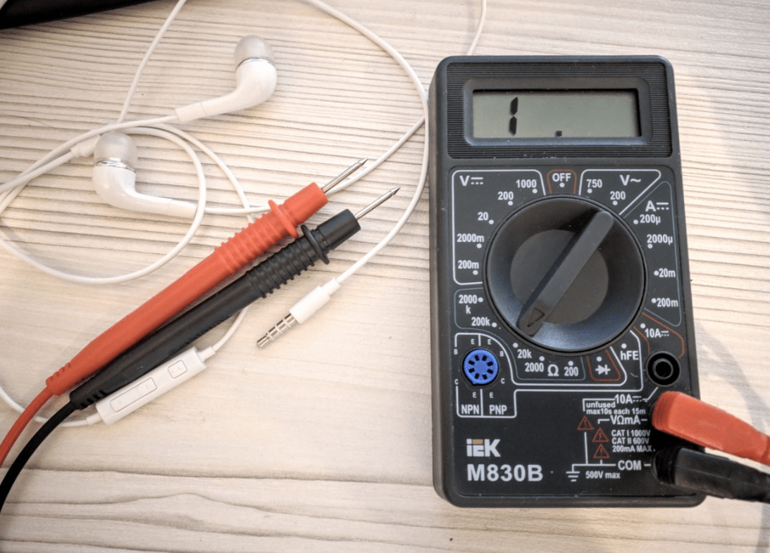 Если ракушка съёмная и возможно добраться к контакту на самом динамике, то для ремонта наушников вначале нужно проверить цепь на разрыв омметром. Для этого один его щуп ставим на вывод динамика, а второй — на вывод разъёма. Если прибор показывает «1» или знак бесконечности, значит целостность кабеля нарушена и он нуждается в ремонте.