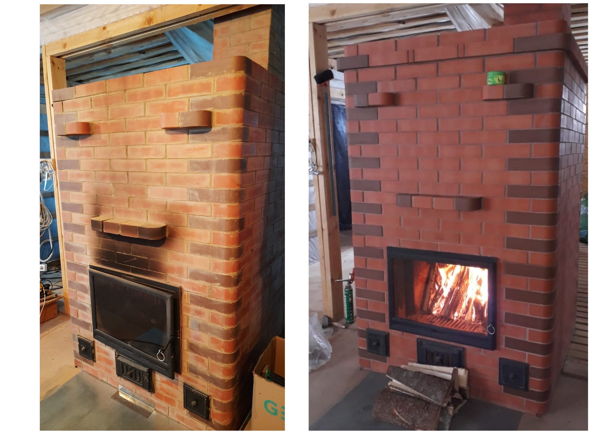 Почему мы не стали делать чистовую отделку кирпича? Дело в том, что после ремонта печи в кладке окажутся два совершенно разных по оттеночной гамме кирпича. И вывести их до одного цвета практически не представляется возможным. Можно было оштукатурить печь, но срок эксплуатации печи без косметического ремонта около двух сезонов.