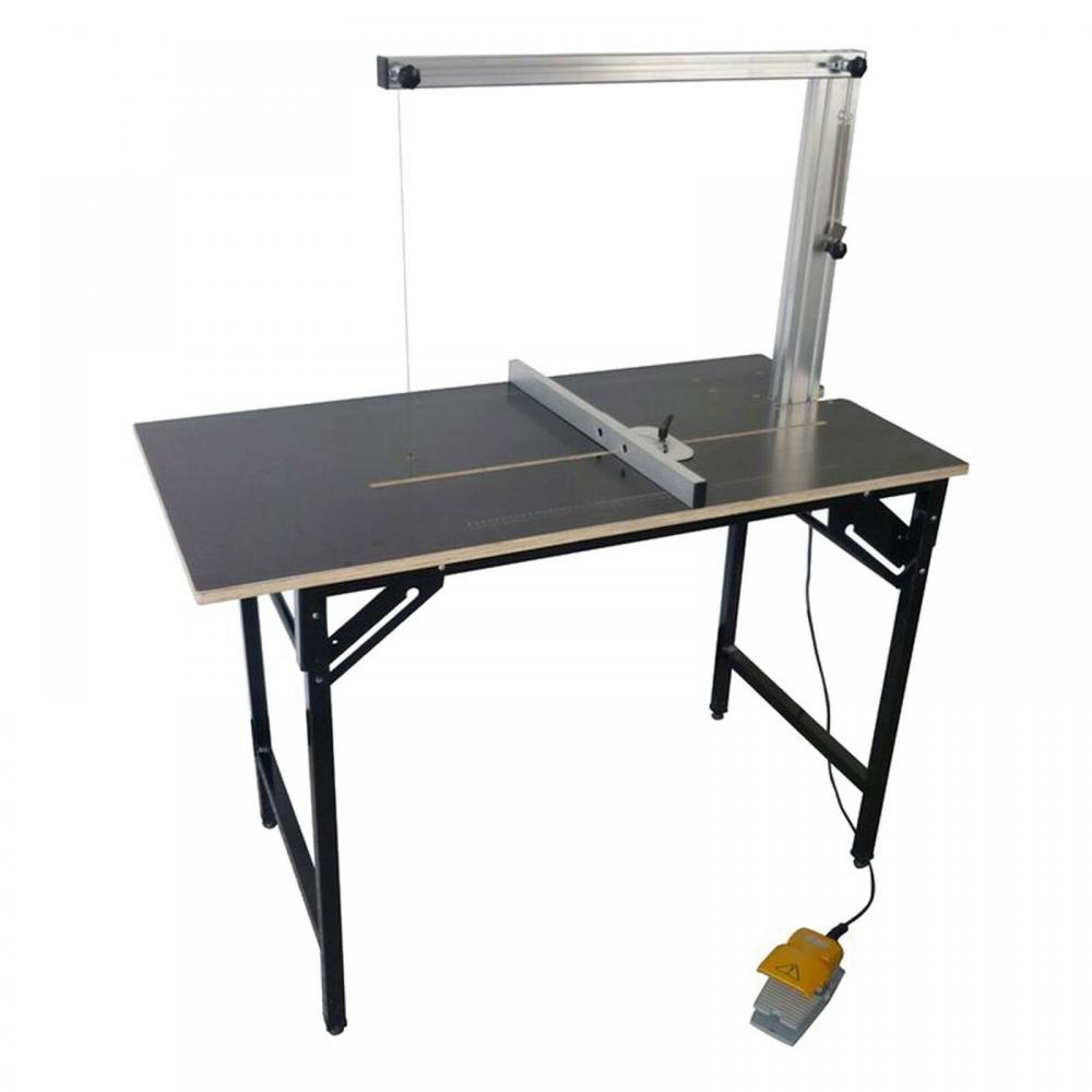 Есть ещё одна вариация данного станка. В ней нихромовая проволока натягивается вертикально поверхности стола, а рабочая поверхность конструируется из ДСП и металлической рамы.