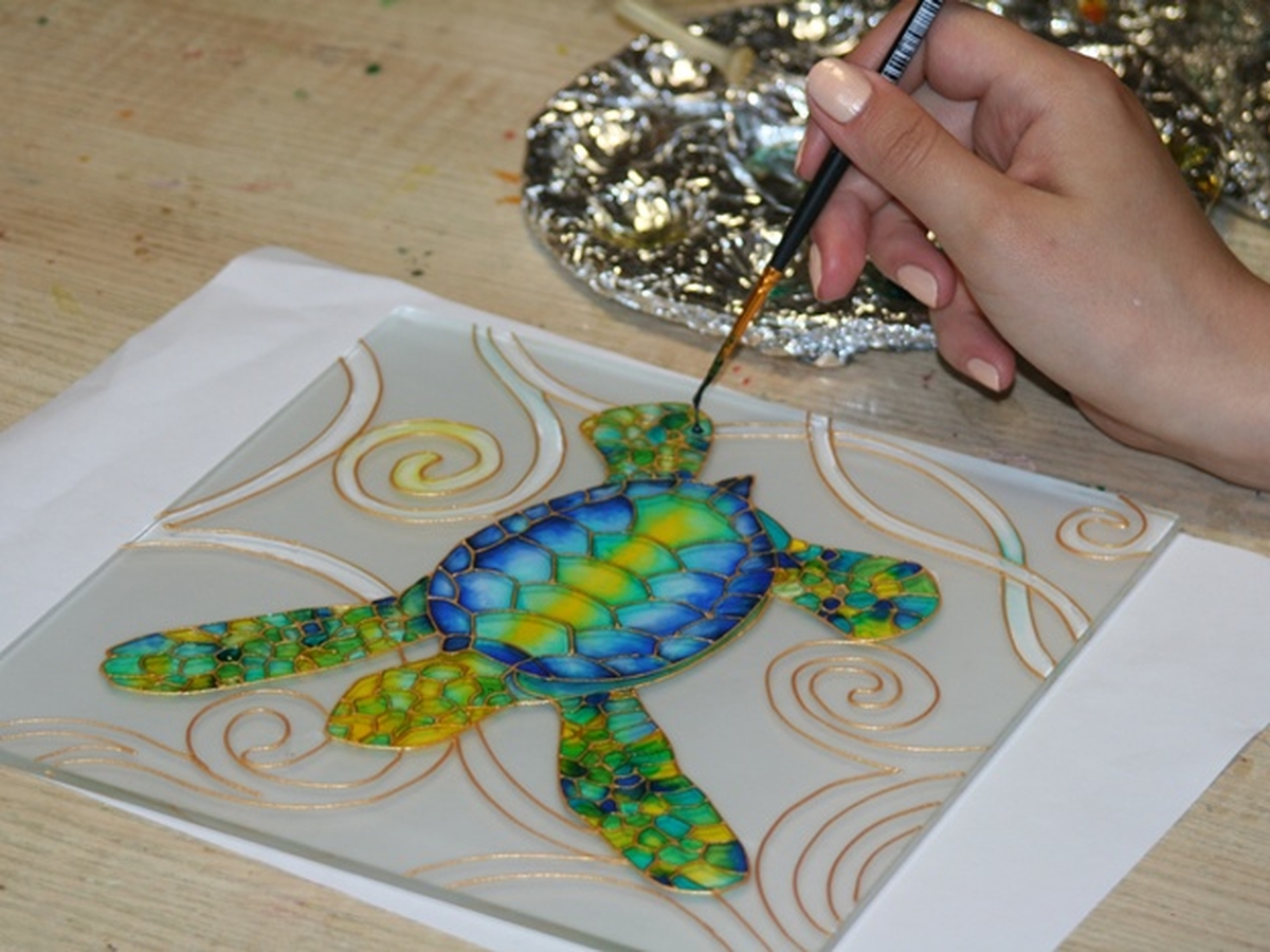 Для работы с красками для витража важно запастись рядом полезных инструментов. Для начала лучше использовать необжигаемые краски