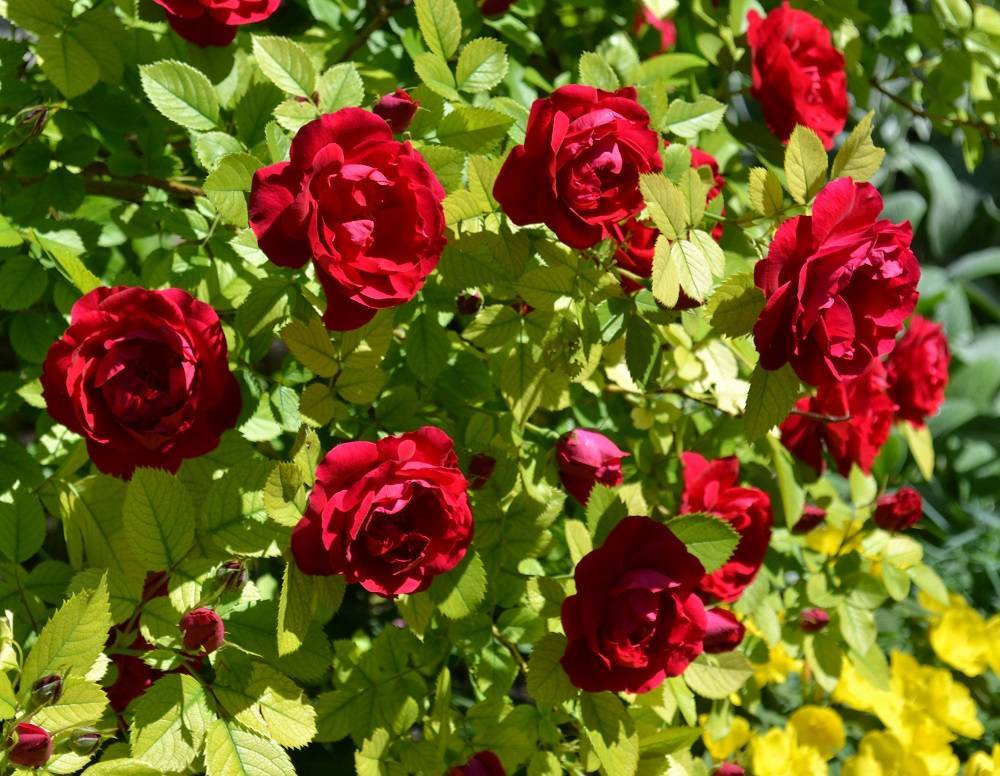 Бутоны под тяжестью лепестков, которых насчитывается 20–40 штук, немного наклоняются вниз. Когда куст цветет ярко-красными махровыми цветками, достигающими 12 см в диаметре, ветви могут сломаться, если своевременно не закрепить на подпорках. На фоне крупных огненных цветков с крупными желтыми тычинками в центре зеленая блестящая листва куста теряется, становится менее заметна.