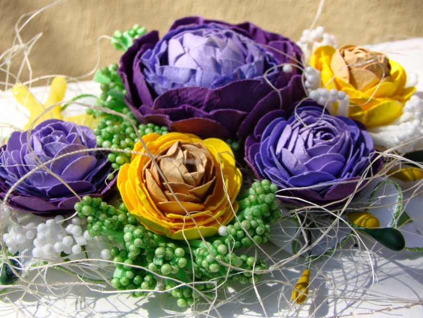 Из готовых цветов, выполненных из бумаги, фоамирана или даже пластилина собирается на основу(как крона дерева. Может быть конусообразной, круглой, овальной. Совершенно любой формы, которая вам понравится).